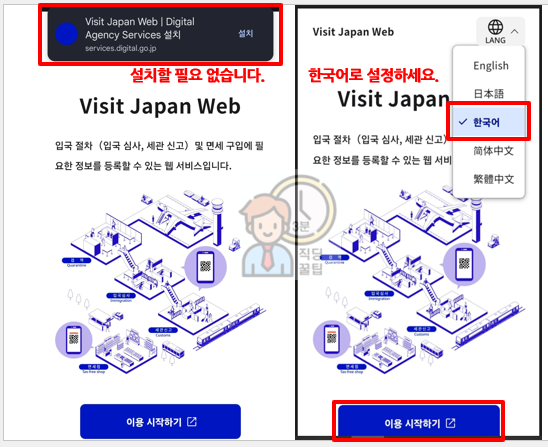 사이트 들어가면 위에 뭐 설치 하라고 하는데 안 해도 등록(이용)가능합니다. 한국어로 언어 설정하고 이용시작하기를 누르세요.