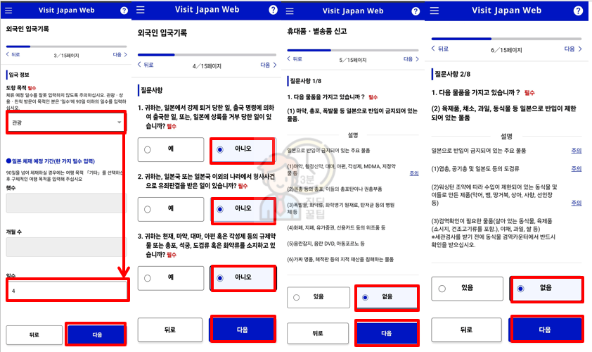 이제 거의 다 완료가 되어갑니다. 입국심사 및 세관신고를 하는 화면으로 들어갑니다.