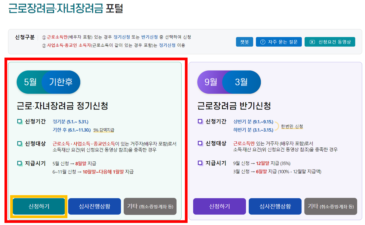 모바일 또는 서면 안내문을 받지 않은 경우에는 홈택스 홈페이지에 접속하거나 홈택스 모바일앱을 다운받아 로그인 후 신청/제출-근로·자녀장려금(정기/반기)에서 신청할 수 있습니다라고 보통 설명을 합니다.