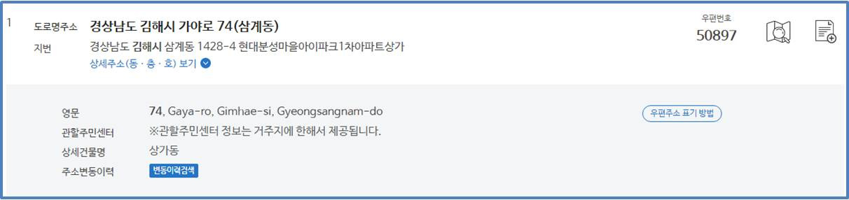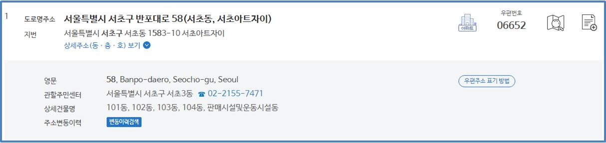 그러면 아래의 화면과 같이 주소 검색 결과창이 나오실 것입니다.
